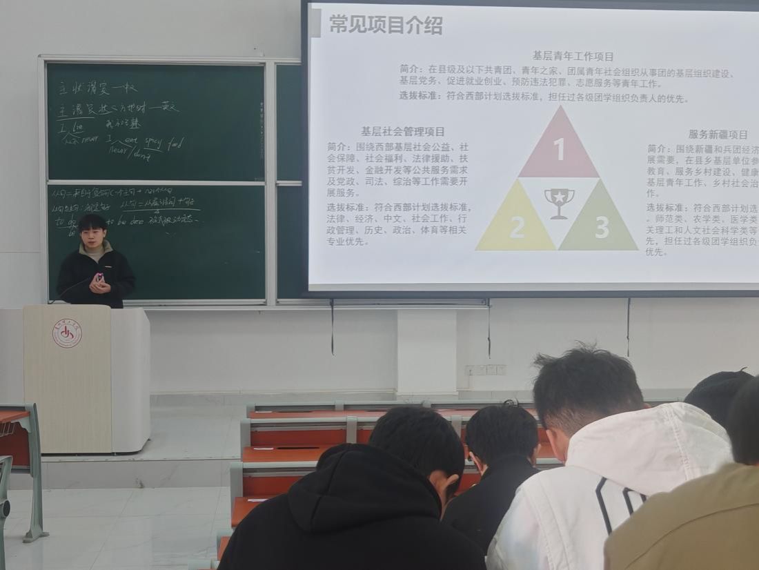 在宣讲会中,崔老师首先系统介绍了西部计划中的三大项目——基层青年工作、基层社会管理与服务新疆项目,详细解读了各项目的服务内容、选拔标准及专业优先方向等核心信息;随后他以“毕业就业四大步”为框架,将西部计划政策全面融入就业指导,依次阐述了“保障顺利毕业”所强调的学业基础、“确定目标方向”对应的项目定位解析、“信息资源收集”涵盖的报名要点与政策福利,以及“付诸实际行动”所指明的报名全流程指导;最后的互动环节,毕业生们围绕服务地分配、考核标准等踊跃提问,崔老师逐一作出详尽解答,现场反响热烈。