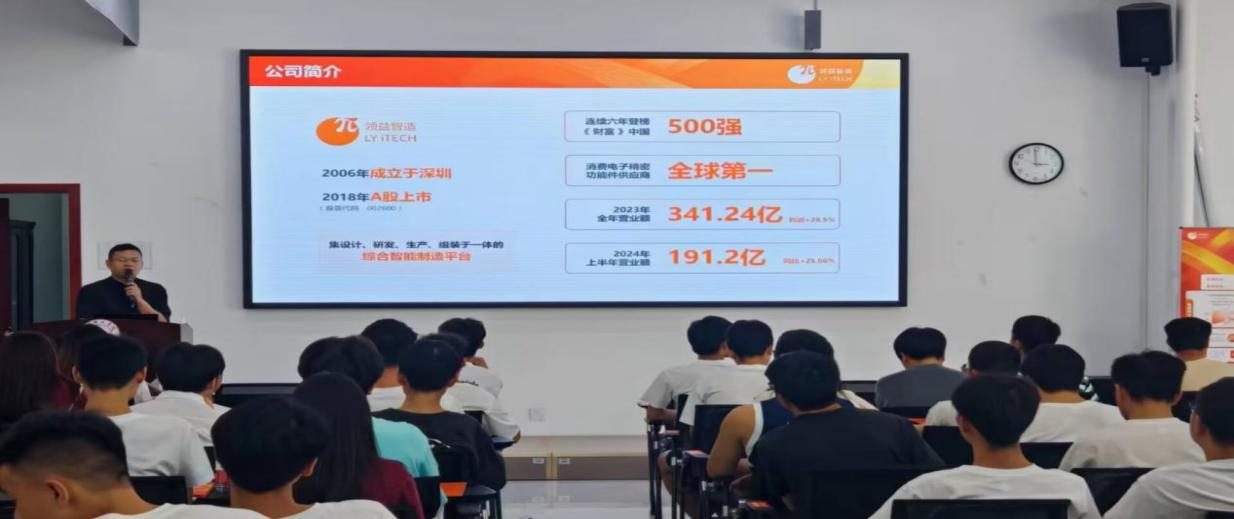 为切实推进我院2025届毕业生就业工作,2024年9月27日下午3时,广东领益智造股份有限公司在我校蕴华楼多功能厅内举办了一场精彩的招聘宣讲会,吸引了众多学子的关注与参与。