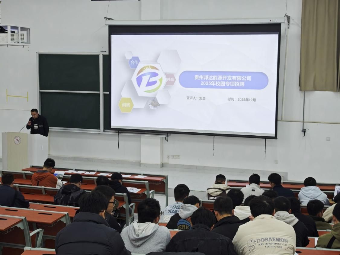 2025年10月30日14:30,贵州邦达能源开发有限公司在致知楼107教室举办校园招聘宣讲会,旨在搭建校企沟通桥梁,助力机械学子实现精准就业。本次宣讲会由贵州邦达能源开发有限公司工作人员刘全主讲,吸引了众多机械学子的关注与参与。