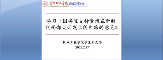 2022年2月27日,机械工程学院学生党支部通过腾讯会议的形式开展主题党日活动,专题学习《国务院关于支持贵州在新时代西部大开发上闯新路的意见》(国发[2022]2号)文件内容,此次活动由学生党支部书记卢缨主持,支部全体成员参加。