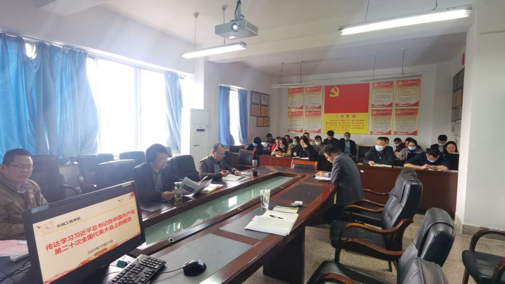 为进一步学习宣传贯彻党的二十大精神,2022年10月21日,机械工程学院组织全体教职工再次学习习近平总书记在中国共产党第二十次全国代表大会上的报告精神。会议强调,全体师生要把学习宣传贯彻落实党的二十大精神作为当前和今后一个时期的重大政治任务,深刻领悟“两个确立”的决定性意义,增强“四个意识”、坚定“四个自信”、做到“两个维护”,切实把学习成果转化为奋进新征程、建功新时代的实际行动。