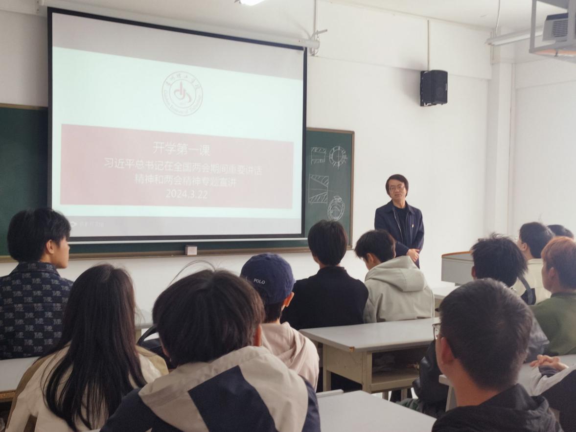 2024年3月22日,机械工程学院党总支书记熊远兴在致知楼503教室为学院学生讲授“开学第一课”。