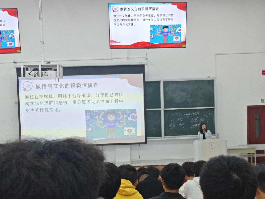 宣讲会上,陈茂老师先以中华优秀传统文化为话题切入,引出宣讲题目“坚定文化自信,建设文化强国——做中国文化的传承者、弘扬者、践行者”。她提出我们在各种文化交织的时代背景下,更应坚持文化的守正创新,紧跟时代步伐,在世界文化中保持自身的独特性和吸引力。
