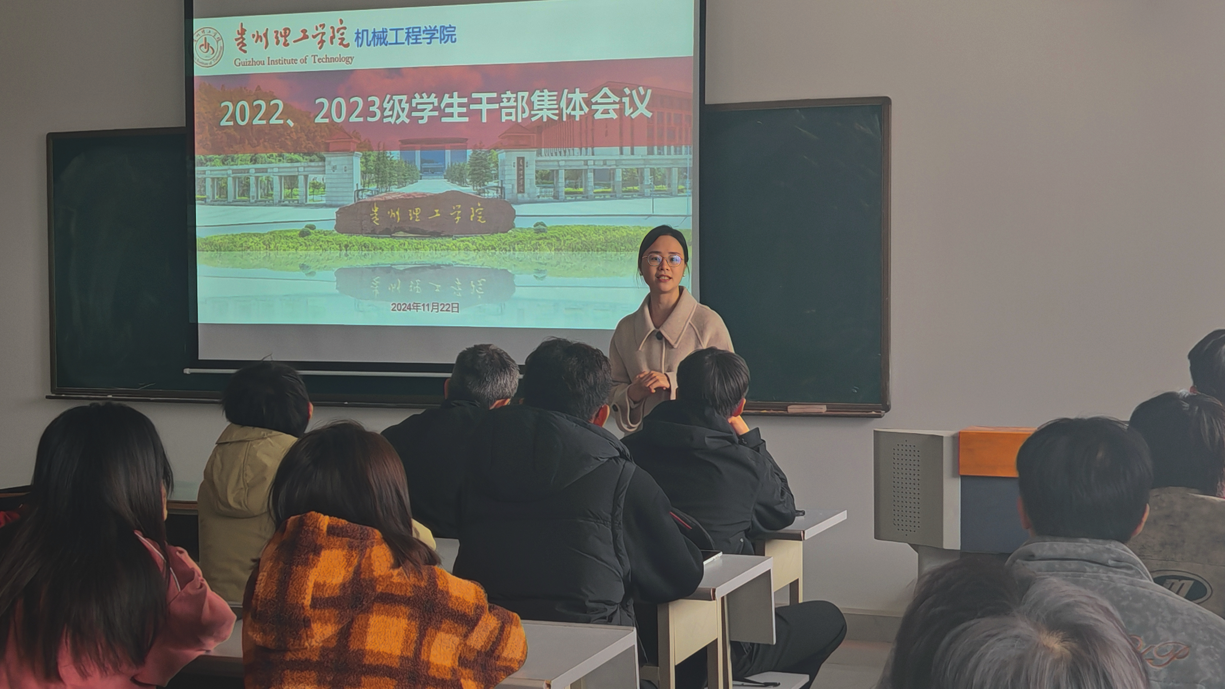 2024年 11 月20日,机械工程学院于致知楼召开各年级学生干部集体会议,旨在全面提升学生干部工作水平与思想觉悟,进一步加强学生干部队伍建设。会议由辅导员罗曼老师和辅导员陈茂老师分别主持,相应年级全体学生干部参会。