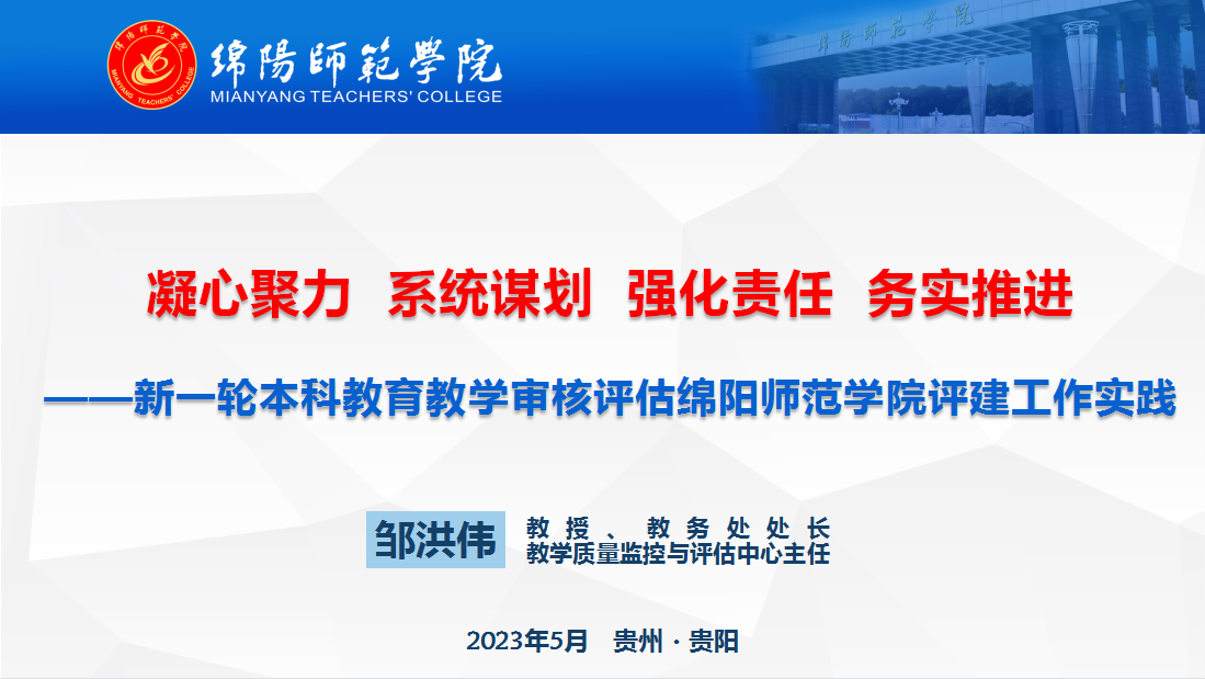 会议邀请教育部评估中心盛敏处长做《以评估定向促建促强 共商共研助推学校高质量发展---新一轮审核评估实践视角》报告、大连理工大学朱弘教授做《新一轮审核评估方案解读与实施要点》报告、绵阳师范学院邹洪伟教授做《凝心聚力 系统谋划 强化责任 务实推进---新一轮本科教育教学审核评估绵阳师范学院评建工作实践》报告。