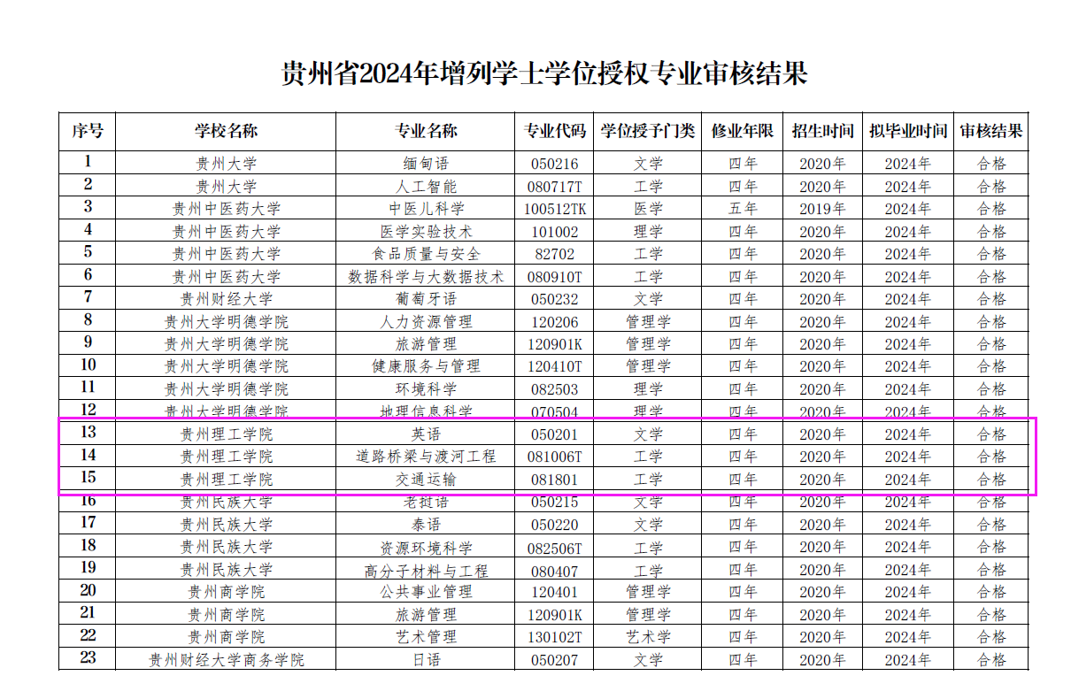 本网讯(图/文 夏黄晶)2024年6月20日,省教育厅学位办发布了《省学位办关于公布2024年贵州省普通本科高校新增学士学位授权专业的通知》,我校英语、道路桥梁与渡河工程、交通运输三个专业审核结果均为合格,顺利通过审核。