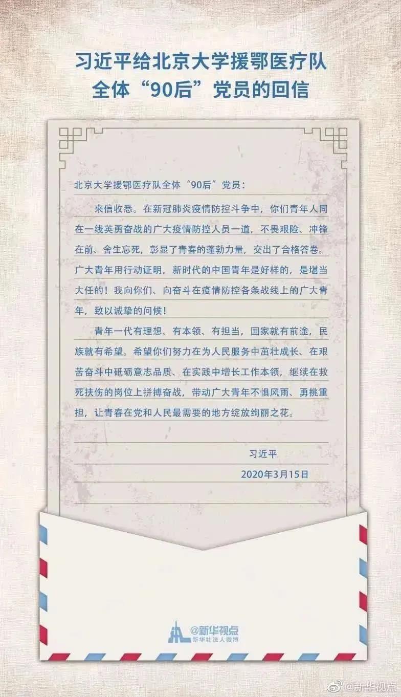编者按:3月15日,习近平总书记给北京大学援鄂医疗队全体“90后”党员回信,向他们和奋斗在疫情防控各条战线上的广大青年致以诚挚的问候,提出殷切的希望。
