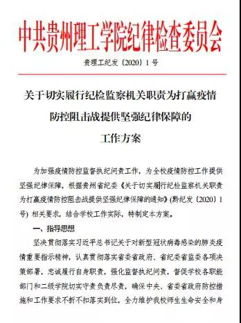 印发贵州理工学院纪委《关于切实履行纪检监察机关职责为打赢疫情防控阻击战提供坚强纪律保障的工作方案》。坚决贯彻落实习近平总书记关于对新型冠状病毒感染的肺炎疫情重要指示精神,认真贯彻落实省委省政府、省纪委省监委各项决策部署,忠诚履行自身职责,强化监督执纪问责,督促学校各职能部门和二级学院切实守责负责尽责,确保中央、省委省政府防控措施和工作要求不折不扣落实到位,全力维护我校师生生命安全和身体健康,为打赢疫情防控阻击战提供坚强的纪律保障。