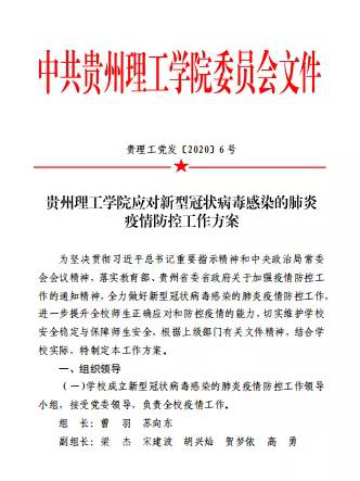为坚决贯彻习近平总书记重要指示精神和中央政治局常委会会议精神,落实教育部、贵州省委省政府关于加强疫情防控工作的通知精神,全力做好新型冠状病毒感染的肺炎疫情防控工作,贵州理工学院党委高度重视,坚持把疫情防控作为当前压倒一切的重大政治任务,及时向各部门、二级学院传达习近平总书记重要指示精神和党中央、国务院及贵州省委省政府决策部署。学校采取一系列疫情防控措施,及时控制传染源、切断传播途径、保护易感人群,切实保障广大师生身体健康和生命安全,坚决打赢阻击病毒传播的人民战争。