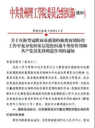 1月28日,学校印发《关于在新型冠状病毒感染的肺炎疫情防控工作中充分发挥基层党组织战斗堡垒作用和共产党员先锋模范作用的通知》,要求基层党组织和党员领导干部提高政治站位、强化责任担当、发挥职能作用,让党旗在防控疫情斗争第一线高高飘扬,为坚决打赢疫情防控这场特殊战役提供坚强的组织保证。