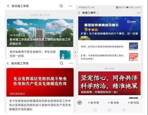 学校按照中央、教育部和贵州省委省政府关于加强疫情防控工作的通知精神,采取推送《贵州理工学院致全校师生员工做好疫情防控工作的倡议书》、普及疫情防控知识等多种有效方式,宣传教育引导全校师生员工提高自我防控意识和能力,及时学习掌握疫情防控知识,养成良好的生活方式,保障大家的身体健康和生命安全。