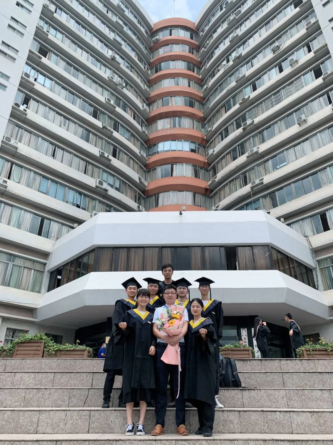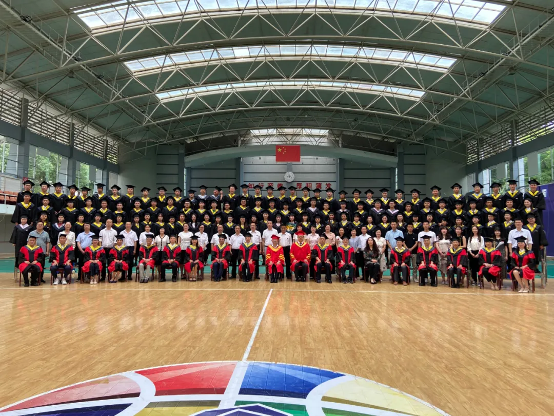 校学位委员会成员为毕业生颁发学位证书、拨正流苏并合影留念。
