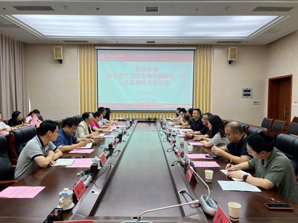 本网讯(图/文 夏黄晶)为学习借鉴兄弟院校本科教育教学审核评估相关工作的宝贵经验和先进理念,6月21日上午,校党委委员、副校长安艳玲率队赴贵州民族大学就本科教育教学审核评估工作开展调研,教务处、发展规划处、国有资产管理处、人事处及评建办工作人员参与调研。贵州民族大学党委委员、副校长周杰及教务处、教育评估中心、招生就业处等有关职能部门负责同志及贵州民族大学评建办工作人员接待了我校一行。会议由教育评估中心主任马飞主持。