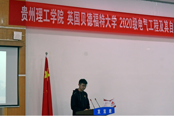 贵州理工学院副院长胡兴灿代表学校对2020级中外合作办学班的同学们来到贵州理工学院的大家庭表示欢迎,勉励大家要学好专业知识,同时强化英语学习能力;保持求知欲和好奇心,具备更强的综合素质;坚定爱国情怀,具备国际视野;坚定文化自信,具备促进中外文化交流的能力。希望同学们刻苦学习,守正创新,努力成为有扎实专业学识、具备国际视野和跨文化交流能力、堪当大任的国际化人才。