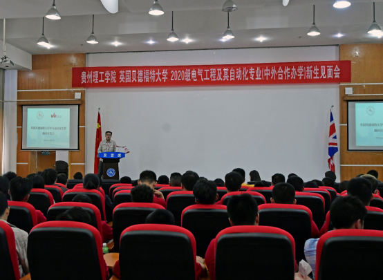 本网讯(国际教育学院 欧阳宇娟/文)枫叶飘红,寒菊浮香。10月12日下午,贵州理工学院与英国贝德福特大学合作举办的电气工程及其自动化专业本科教育项目2020级新生见面会在蔡家关校区喀斯特报告厅成功举行。校领导胡兴灿,英国贝德福特大学中国办公室主任Colin WANG一行以及学校相关职能部门负责人,中外合作班辅导员、班主任,中外合作班全体新生、高年级学生代表参加了开班典礼。