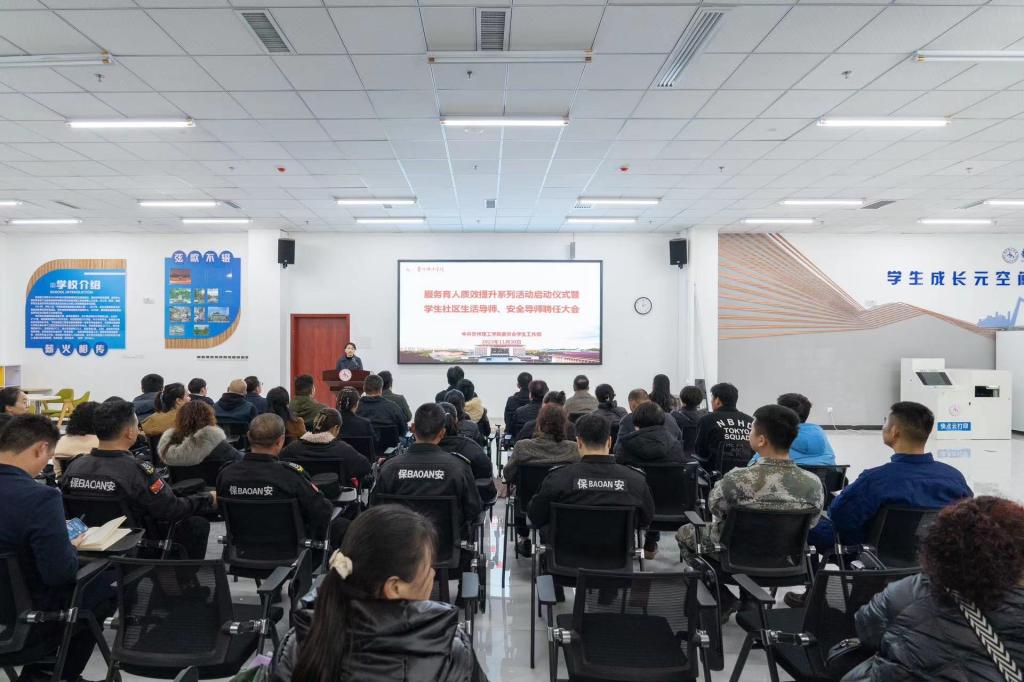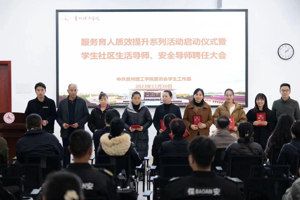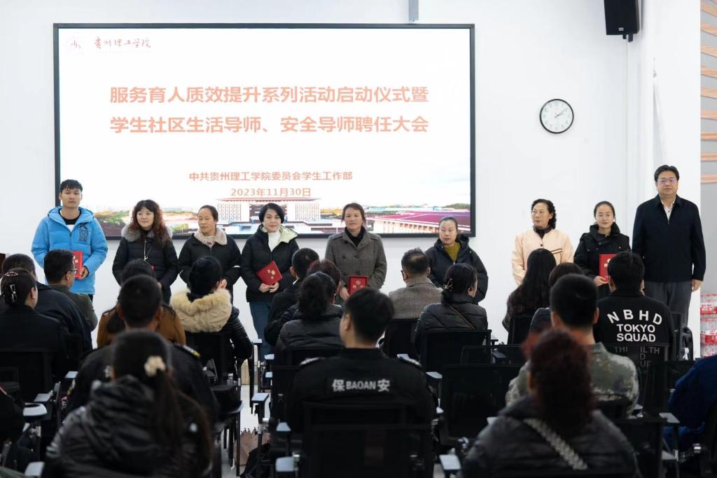 本网讯(学生工作部 杜安定)为深入推进学校“一站式”学生社区综合管理模式建设,持续有效提升服务育人成效,更好地将“三全育人”工作落细落实,11月30日下午,贵州理工学院服务育人质效提升系列活动启动仪式暨学生社区生活导师安全导师聘任大会在蕴华楼学生综合服务大厅召开。校党委书记苏向东、党委副书记高勇出席会议。校党委宣传部、学生工作部、保卫工作部、后勤管理处、科技园等相关部门负责同志,物业公司管理人员、宿管、保安以及服务商代表现场参会。