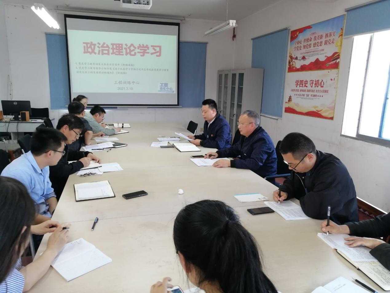 工程训练中心于3月19日下午在会议室进行政治理论学习,会上钟晓锋书记领学了习近平总书记在党史学习教育动员大会上的重要讲话。
