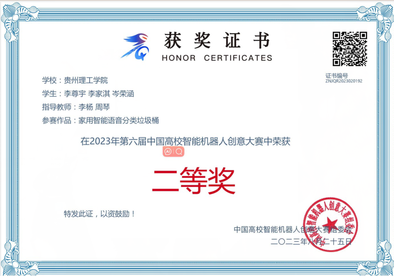 图2 贵州理工学院团队获得国赛二等奖