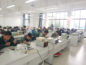 电子工艺训练室位于工程训练中心综合训练大楼三楼,面积:150 m⟡。其主要设备情况:实训台(36张);函数发生器(40台);示波器(40台);可调直流电源(40台)。实训室可作为集成电路板的检修、调试实验台,也可作为电子产品安装与调试操作台。通过电子工艺实训,让学生掌握电气仪器仪表的使用、常用电子元器件的识别和使用、普通电路设计能力,同时具备一定焊接技术。电式工艺实训,注重学生实践能力、独立获得知识能力和提出、分析、解决实际问题能力的培养,加强工艺教育,为学生建立工艺基础平台,使学生获得现代电子工业的基础知识。主要开设实验项目:1. 安全知识及操作规范、元器件基础知识实训;2. 电子元器件识别、检测方法实训;3. 焊接练习实训;4. 小型电子产品的制作、电路的焊接、安装;5. 小型电子产品的制作、电路的调试。