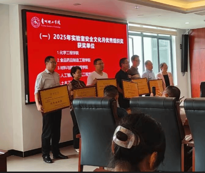 2025年9月19日,贵州理工学院2025年实验室安全活动月系列活动圆满落幕。化学工程学院凭借扎实的安全管理举措、全员参与的积极氛围及优异的竞赛表现,在此次活动中斩获“优秀组织奖”,“实验室安全卫生及文化环境建设评比二等奖”等集体荣誉,并有多个师生团队及个人分获实验技能大赛、安全知识竞赛等专项奖项,充分展现了学院在实验室安全管理与文化建设中的突出成效。