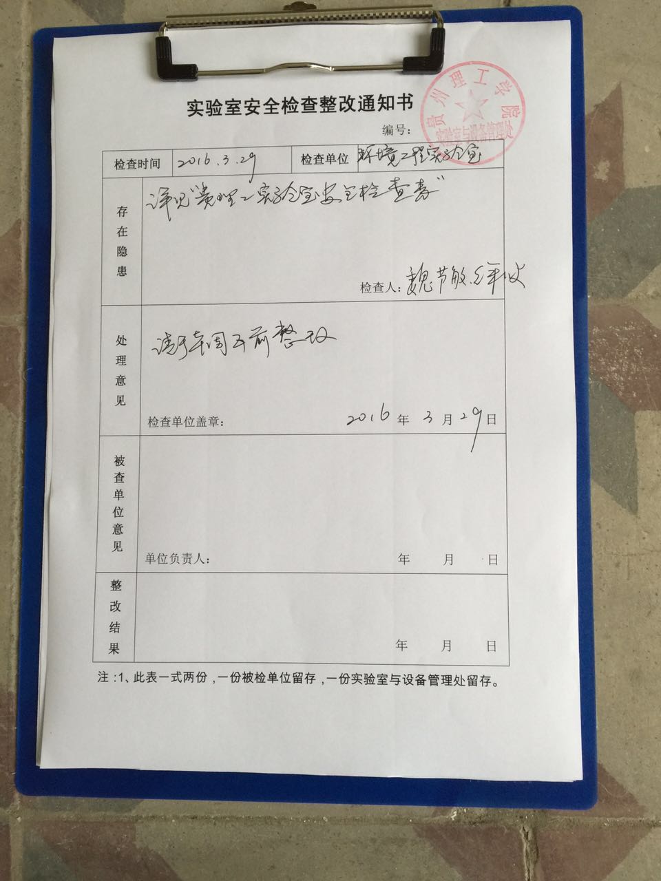 安全工作检查活动历时3天,涉及全校所有教学和科研实验室。检查内容包括:实验室使用安全情况、危险化学用品、实验室环境安全、消防安全、特种仪器设备使用情况等。检查过程中,检查组一行针对个别实验室存在的实验室安全制度建设问题、化学药品管理问题、实验室文化建设问题、实验室使用安全的问题、实验室消防设施配置等问题与各教学、科研实验室负责人交换了意见,并对于发现的问题及时记录。检查结束后,根据检查情况实验室与设备管理处对存在问题的实验室下发了整改通知书,并及时统计所缺消防器材上报保卫部门进行补充。