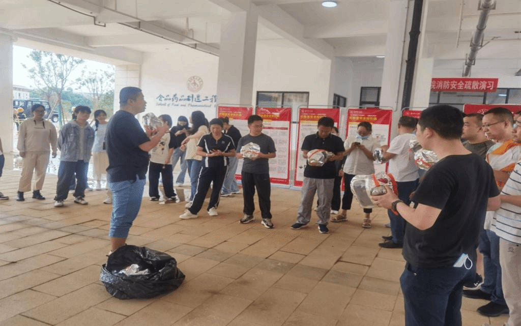 此次培训由食品药品制造工程学院承办。培训内容主要包括两个部分:一是参训师生参加了在酝知楼实验室的消防应急疏散演练。培训重点对实验室着火、应急设施使用、个人防护面罩使用、应急响应以及安全处置等进行了演练。培训现场,全体参训人员不仅在签名墙上留下承诺,还体验了防护面罩的佩戴,并对应急防护用品使用进行了实操。