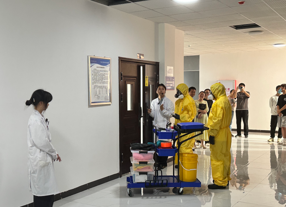 第二场是在化学工程学院酝知楼315实验室举行危险化学品事故应急演练活动。本次演练选取实验课堂上危险化学品(硫酸)意外泄露作为预设场景,通过全情景、全装备、全要素的模拟演练,提升了对危险化学品泄露突发事件的应急处置和个人防护能力。演练过程中,翟老师重点对如何在事故发生第一时间使用喷淋装置处理伤情;如何穿戴防护服、隔离手套和防护面罩;如何小心细致处置事故现场;如何对实验室环境进行恢复和检测进行了培训。除此之外,部分学生还参加了实验室灭火器使用的实操训练。