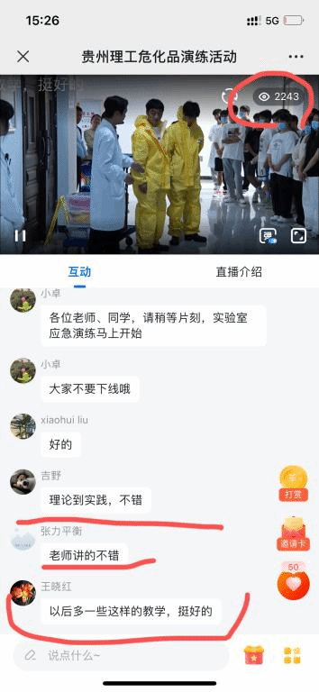 此次活动学校首次尝试以现场直播的形式开展线上和线下的实验室应急演练同步培训,活动当天线上3185人次师生观看了线上直播。线上师生纷纷表示:演练活动内容丰富,切近生活;活动形式新颖直观,生动形象;线上师生讨论互动踊跃发言,认为本次演练活动获益匪浅,也希望“以后多一些这样的教学”活动。