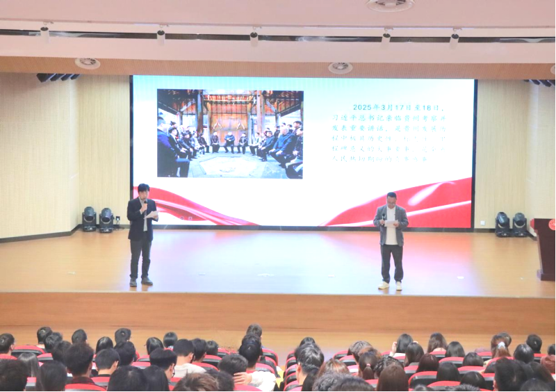 为深入学习贯彻习近平总书记在贵州考察时的重要讲话精神,2025年5月27日晚,学院在蕴华楼四楼多功能厅开展第二轮集中宣讲。学院党总支副书记罗波、副院长朱国飞结合“理论+实践”,以双人同台宣讲的形式带领300余名师生代表展开学习。
