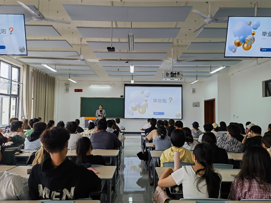 学生科负责人黄文粤从国家政策、区域发展与行业需求三个层面分析就业形势。她指出,尽管2026届高校毕业生规模持续增大,但政策红利持续释放,基层岗位、企业吸纳与参军入伍等渠道不断拓宽。她结合三个专业的就业方向,系统介绍考公考编、企业就业与升学深造等路径,并提醒学生善用学校与政府官方平台获取信息,增强求职辨别力。