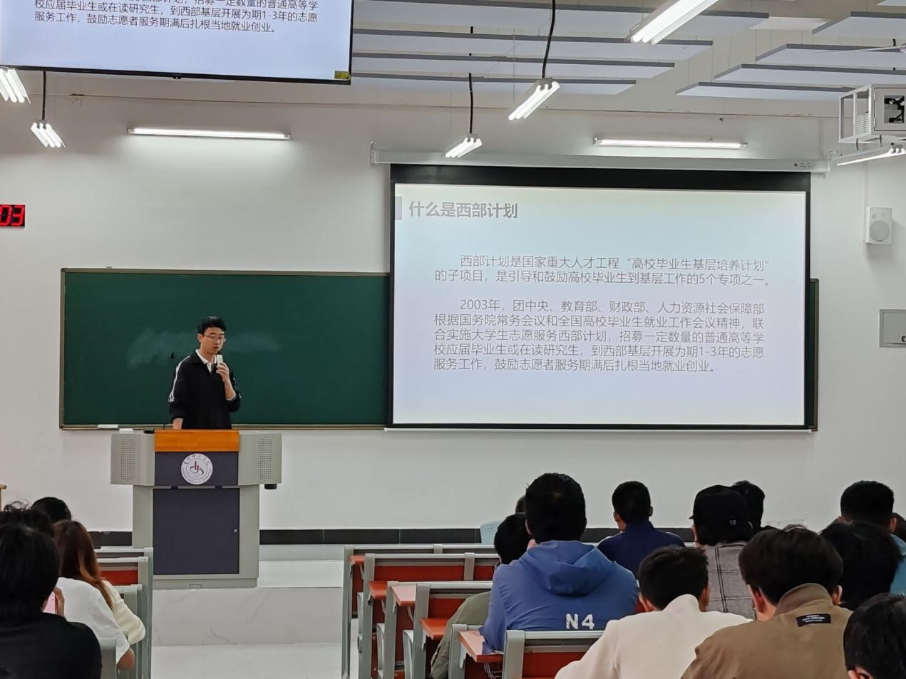 林老师在宣讲会上从西部计划含义、常见项目专项介绍、招募要求等方面进行讲解,鼓励同学们抓住机会,到西部基层锻炼成长,梳理了西部计划流程和时间表,确保同学们明白整个参与过程,并解答了同学们对政策、生活补助和职业发展等内容的疑问。