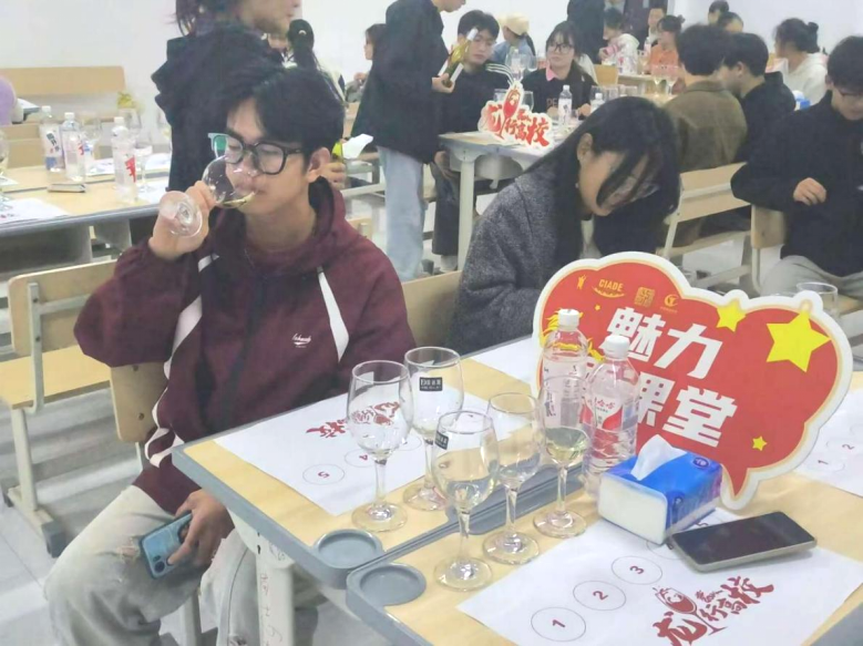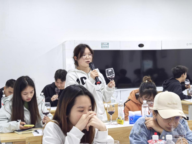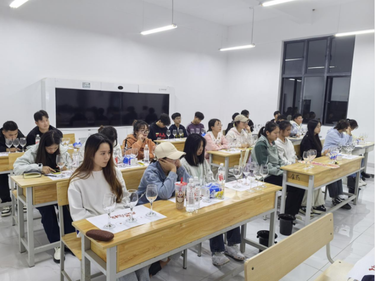 随后,品鉴环节正式开始。在主持人许存宾老师的引导下,师生依次品鉴多款来自贺兰山产区的经典佳酿。每一款酒都经过精心挑选,代表贺兰山产区葡萄酒的精髓。品鉴过程中,师生仔细观察酒体颜色,轻嗅酒香,细品酒味,不时与同伴交流心得,现场气氛热烈而融洽。