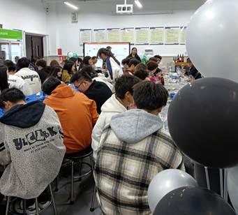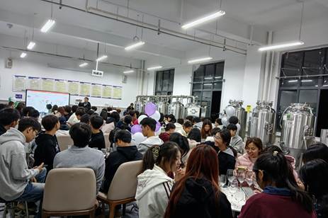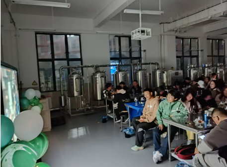 活动现场布置温馨,教室内的专业设备与气球装饰相映成趣。提前布置的60个位置随后紧急增加到了90个,现场的新生们积极主动帮忙搬动桌椅。紧接着迎新环节以专业体验拉开序幕:指导老师围绕食品与发酵工艺展开讲解,结合现场展示的饮品样品,从原料选取、风味调配到品质品鉴,生动科普了食品制造的专业知识,让同学们在“尝味”中直观感受专业魅力。