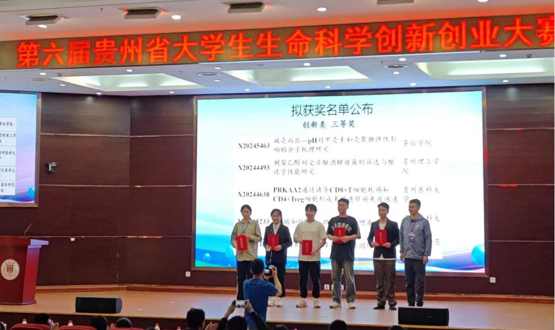 “全国大学生生命科学竞赛(CULSC)”是生命科学领域的顶级权威赛事,属于教育部A类学科竞赛,是教育部官方认可的顶级赛事之一。旨在通过竞赛形式,促进大学生对生命科学领域的学习和研究,拓宽学术视野,培养学生的创新能力和团队合作精神。全国大学生生命科学竞赛已举办九届、贵州省大学生生命科学竞赛已举办六届。食品药品制造工程学院积极组织学生参赛,并在各方面给予大力支持。我院师生在参加的六届赛事中均有多个参赛队取得优异成绩,其中刘晓柱老师指导的参赛队伍已获国家一等奖2项、国家二等奖4项,国家三等奖3项、省级一等奖3项、省级二等奖5项、省级三等奖11项。