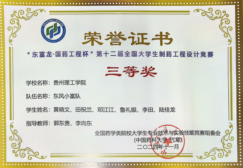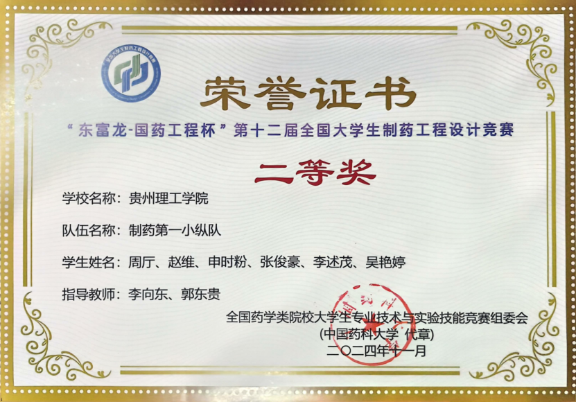 2024年11月17日,第十二届“东富龙-国药工程杯”全国大学生制药工程设计竞赛全国总决赛落下帷幕。经过激烈角逐,学院2支参赛队伍在比赛中斩获佳绩,荣获二等奖1项,三等奖1项。