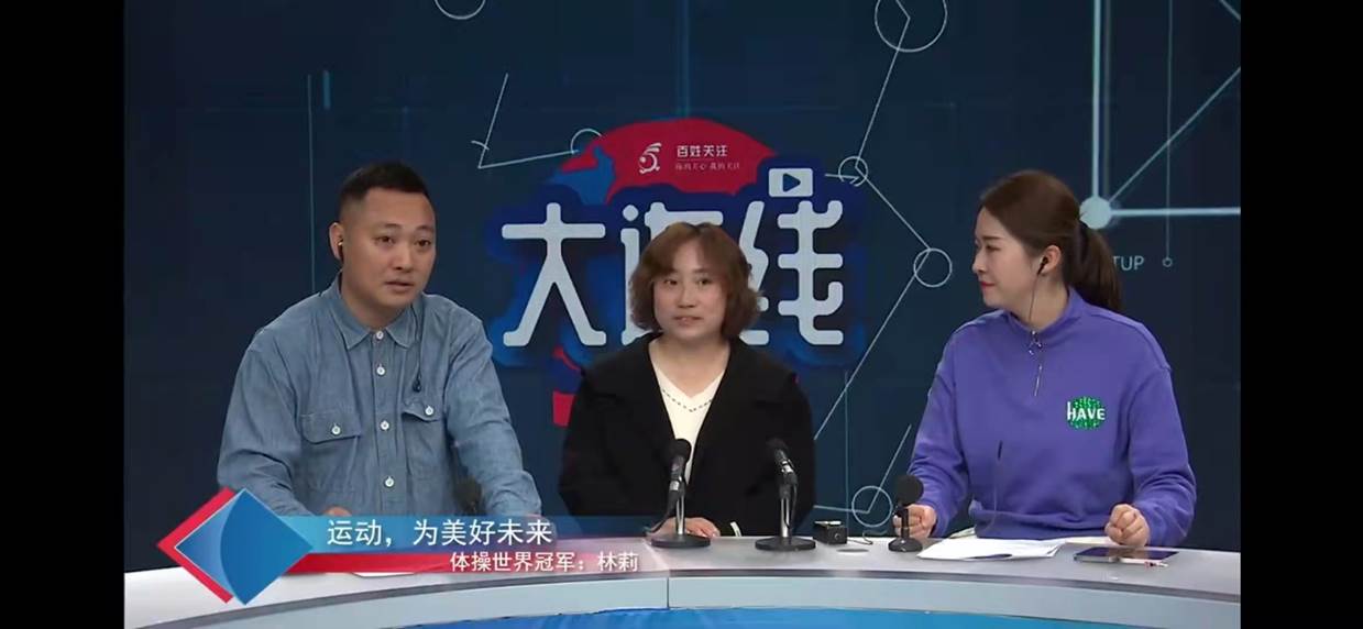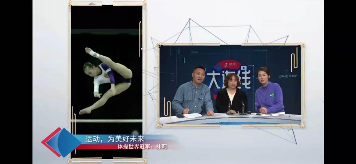 林丽在现场谈到:体操是一个全面发展的体育项目,利于进校园开展,帮助学生提高身体综合素质,比如力量、身体灵敏度、协调性、平衡力等,对青少年儿童的成长非常有帮助。希望将来能有更多的学生参与其中,切身感受体操运动的魅力。节目的最后,林丽详细的介绍了我校公共体育的丰富多彩和休闲体育专业发展现状,通过丰富多彩的趣味活动,在轻松、愉悦的氛围中畅聊体操。