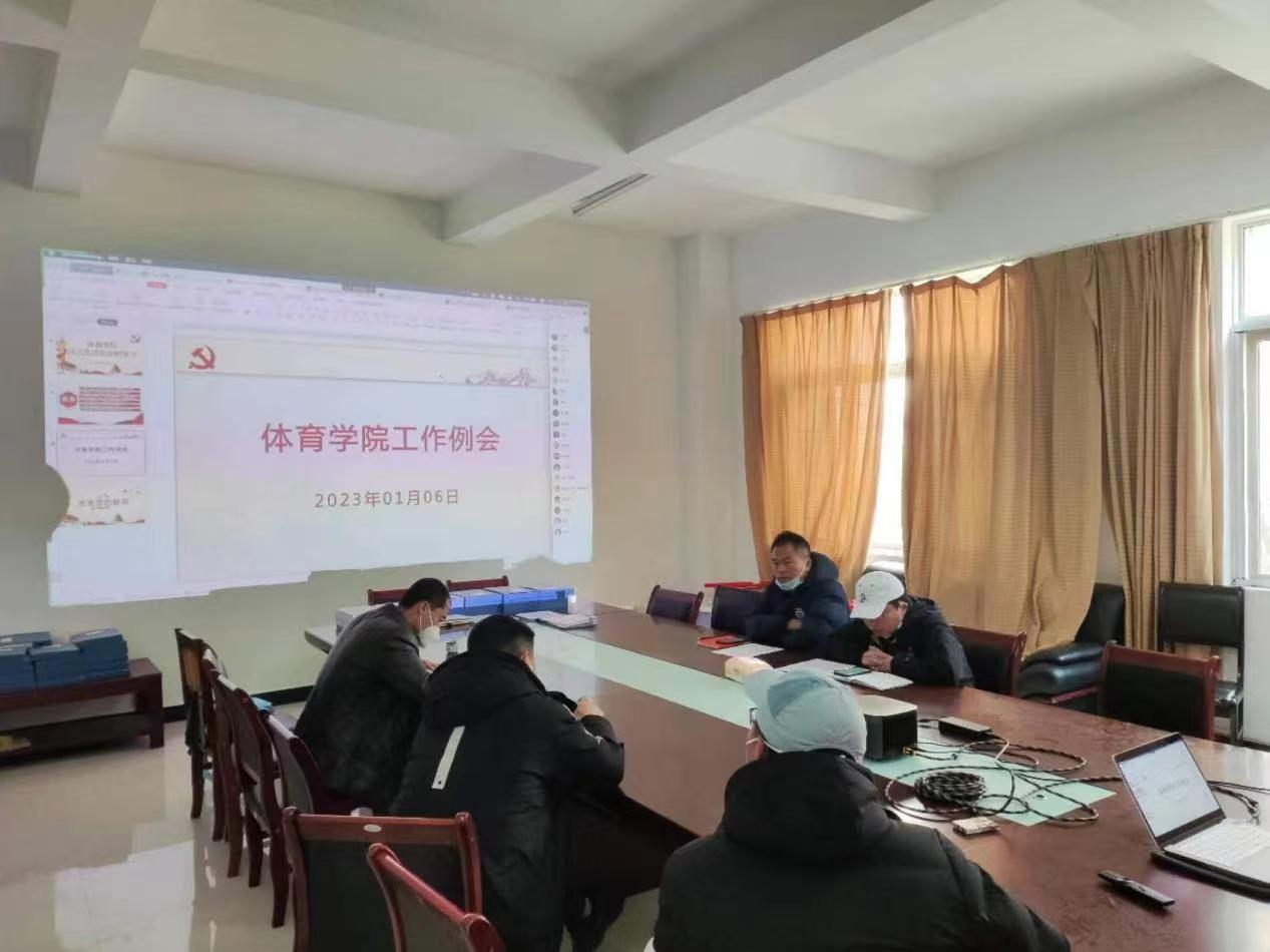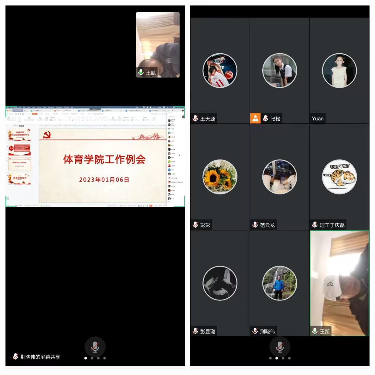2023年1月6日下午,体育学院通过网络会议平台组织召开工作例会,学习党的二十大和二十届一中全会精神,学院全体教职工参加会议,会议由院党总支副书记王凯主持。
