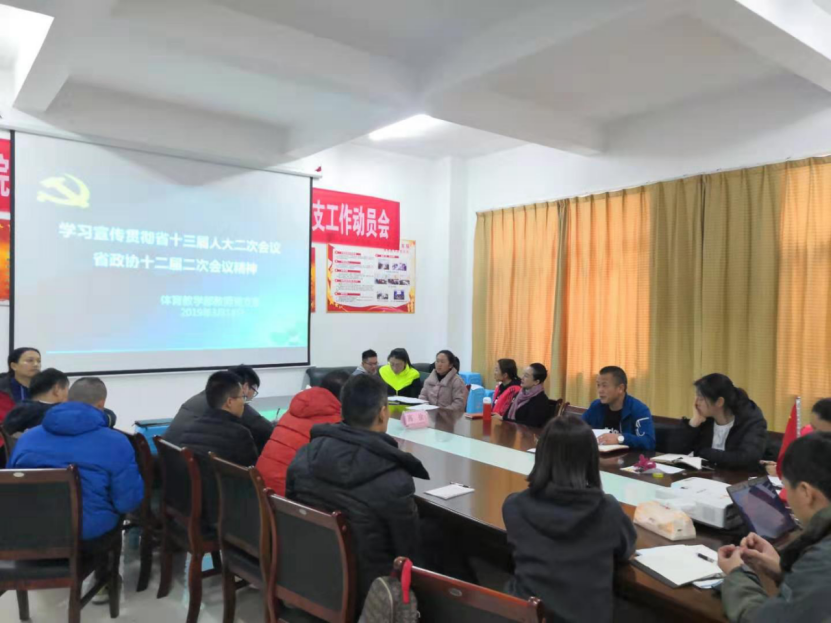 (体育部赵艳平)3月13日中午,体育教学部全体教职工在会议室召开关于认真学习宣传贯彻省十三届人大二次会议省政协十二届二次会议精神的会议,体育部党总支书记任永开主持会议。