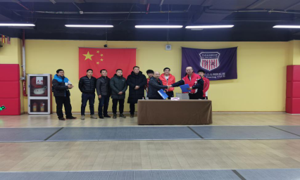 最后,贵州理工学院体育学院高徐院长与贵州斗点击剑俱乐部总经理任伟先生进行签约授牌仪式。