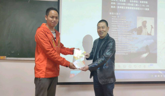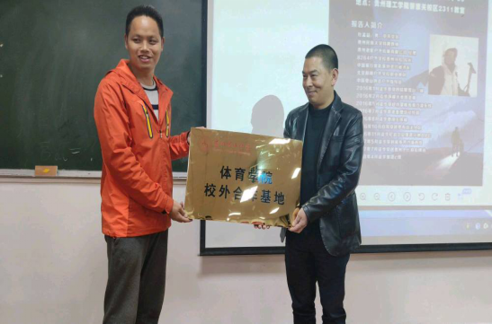 讲座开始前,田广老师代表体育学院,向杜孟益先生授予贵州理工学院体育学院校外合作基地牌匾和聘书;另外,田广老师还代表体育学院教学团队主编出版的《大学生素质拓展训练》教材赠送给杜孟益先生。