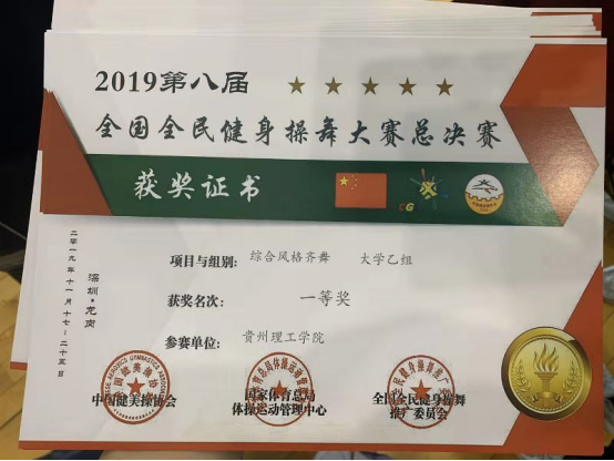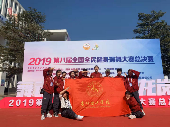 本次比赛,贵州理工学院健美操队在袁朝烨,彭显璐两位教练员带领下,获得了普通高等院校街舞综合风格齐舞全国一等奖、街舞规定套路:2015 Hiphop推广套路全国二等奖和最佳编排奖。