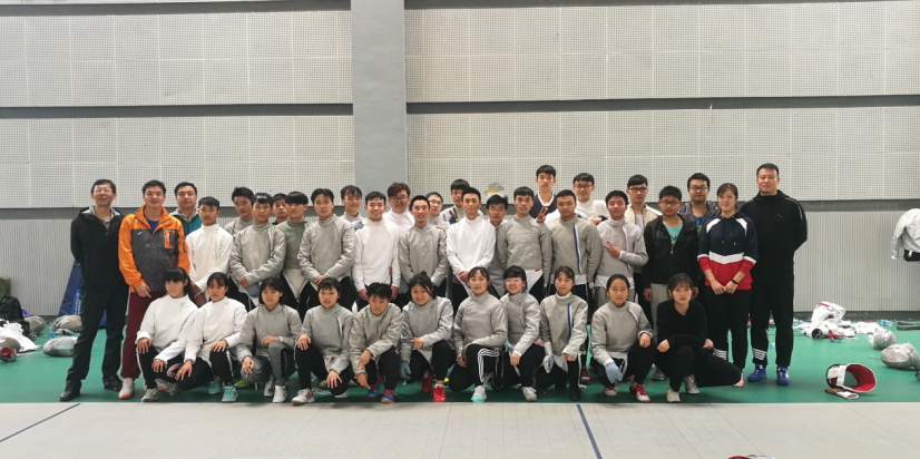 赛前,我校队员们在汤志伟教练和孙赫男教练的带领下对市体校击剑队的教练们和队员们表示了热烈的欢迎,接着双方队员进行了赛前的热身运动,大家穿戴好服装护具,蓄势待发。