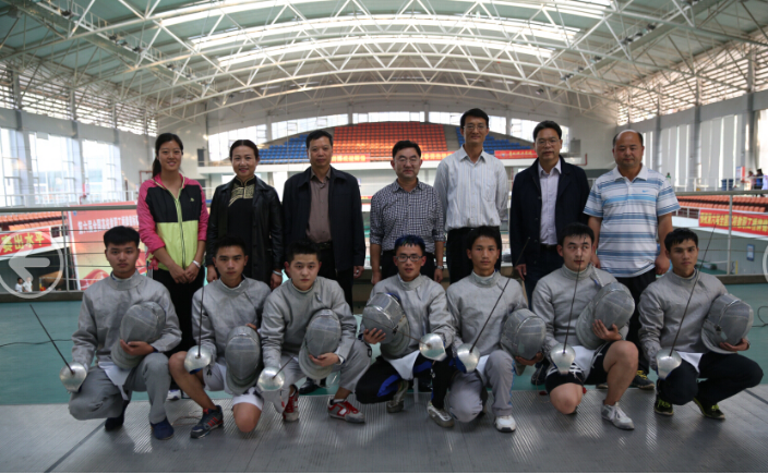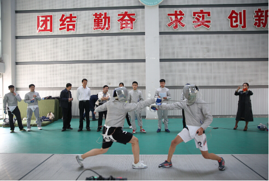 10月20号下午16:00我校曾羽书记、宋广强副书记、副校长梁杰、景亚平、王建平一统到体育馆看望我校击剑队运动员。