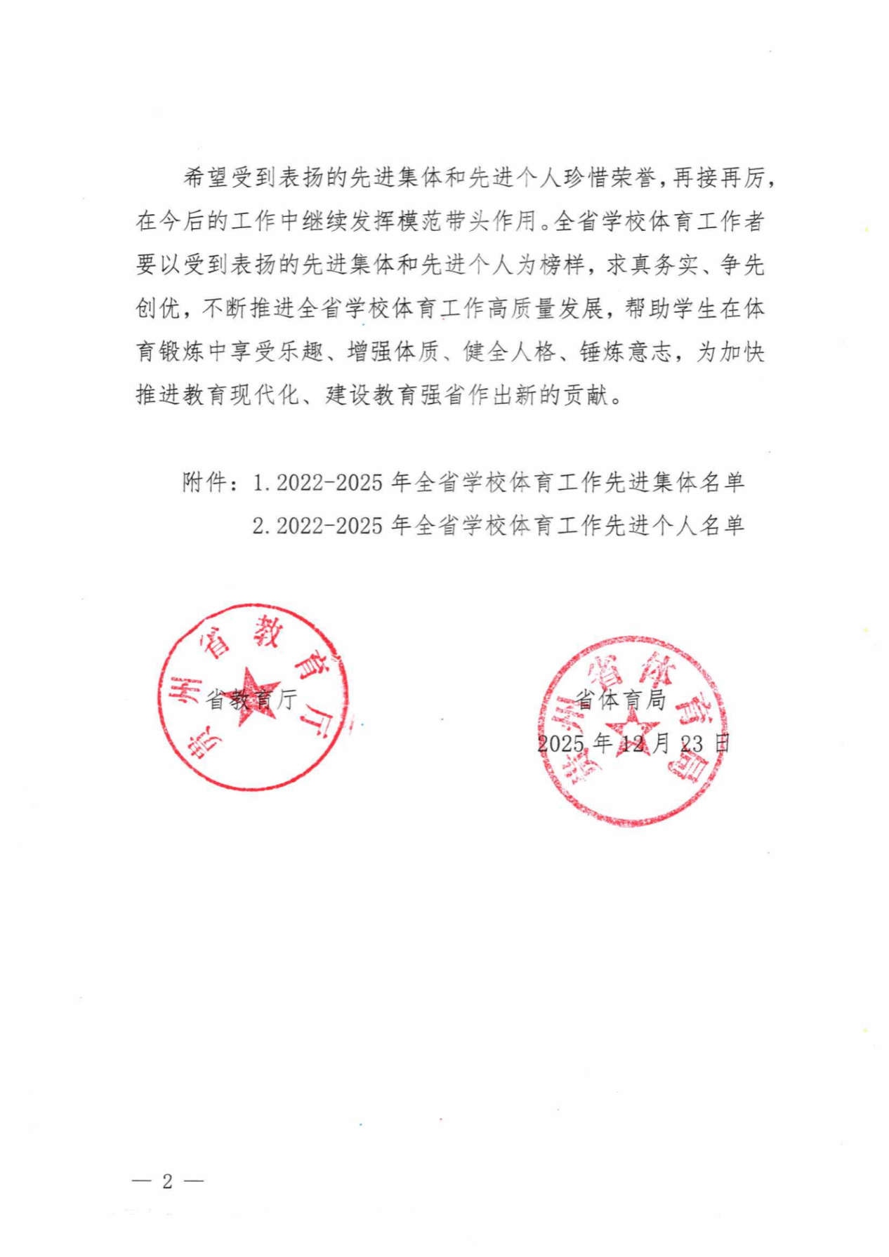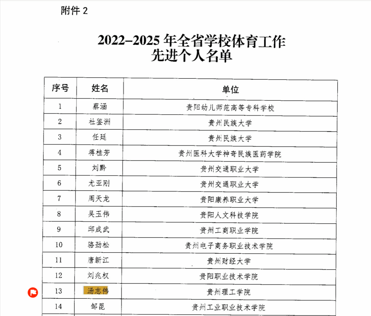 近日,贵州省教育厅、贵州省体育局联合下发《关于对2022-2025年全省学校体育工作先进集体和先进个人进行表扬的通报》(以下简称《通报》),对在全省学校体育工作中表现突出的集体和个人予以通报表扬。我院汤志伟、李小可两位教师凭借在体育教学、运动训练、赛事组织等方面的突出贡献,荣获“2022-2025年全省学校体育工作先进个人”荣誉称号。