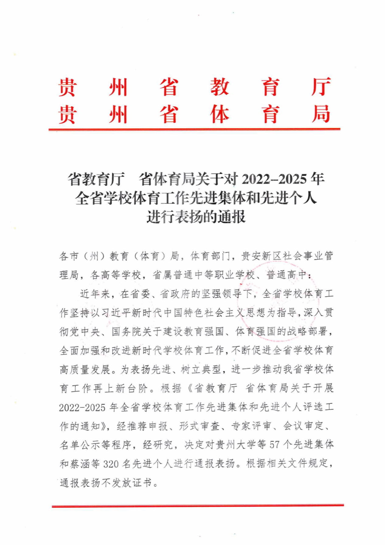 近日,贵州省教育厅、贵州省体育局联合下发《关于对2022-2025年全省学校体育工作先进集体和先进个人进行表扬的通报》(以下简称《通报》),对在全省学校体育工作中表现突出的集体和个人予以通报表扬。我院汤志伟、李小可两位教师凭借在体育教学、运动训练、赛事组织等方面的突出贡献,荣获“2022-2025年全省学校体育工作先进个人”荣誉称号。