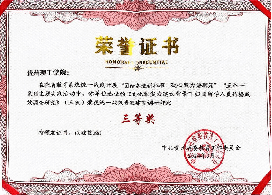 近日,省委教育工委表彰了2023年度“团结奋进新征程·凝心聚力谱新篇”“五个一”系列主题实践活动成果。其中,我院党总支副书记王凯所撰写的《文化软实力建设背景下归国留学人员传播成效调查研究》调研报告,荣获统一战线咨政建言调研评比三等奖。