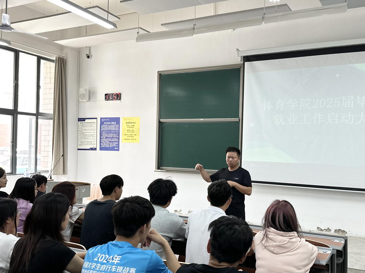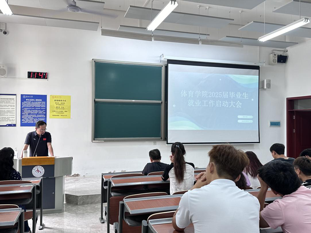 在严峻的就业压力下,为了让毕业生及早的了解就业形势和用人单位需求,增强毕业生就业的紧迫感提高就业热情,9月6日下午,体育学院在开物楼115教室召开了2025届毕业生就业动员大会。大会从“引导学生就业心理”“深挖单位用人需求”“对接供需就业平台”三步骤全面部署我院2025届毕业生的就业工作,体育学院党总支书记杨鉴福、副书记王凯、副院长刘世多、就业辅导员老师以及2025届毕业生参加了本次会议。