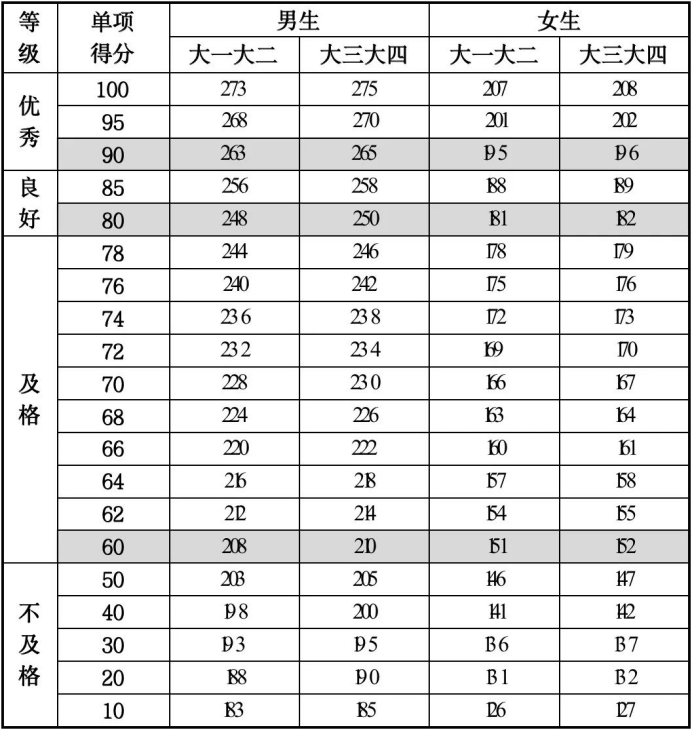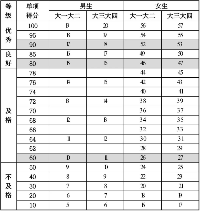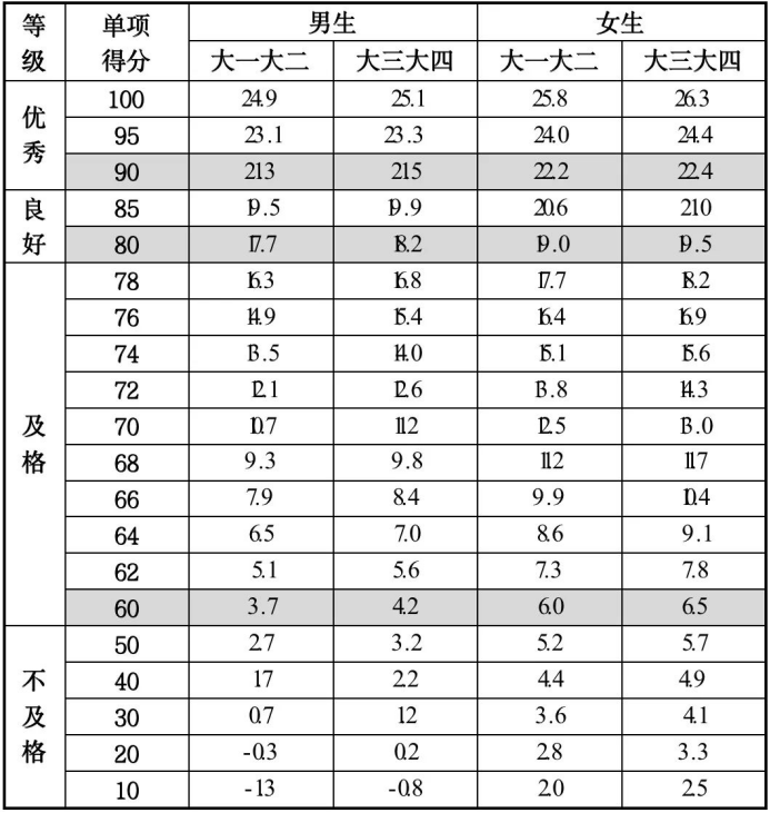 注:引体向上、一分钟仰卧起坐均为高优指标,学生成绩超过单项评分100分后,以超过的次数所对应的分数进行加分。