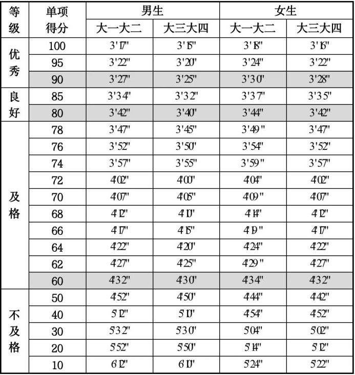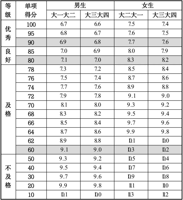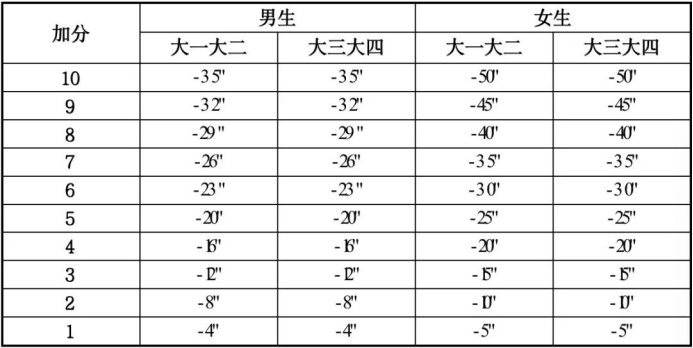 注:1000米跑、800米跑均为低优指标,学生成绩低于单项评分100分后,以减少的秒数所对应的分数进行加分。