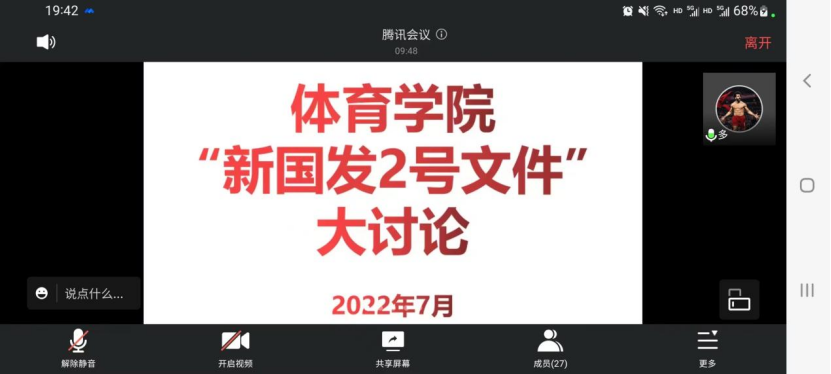 2022年7月5日,体育学院通过线上会议开展了关于《国务院关于支持贵州在新时代西部大开发上闯新路的意见》(国发〔2022〕2号)的讨论会,全体教师参加,会议由体育学院副院长刘世多主持。